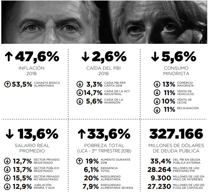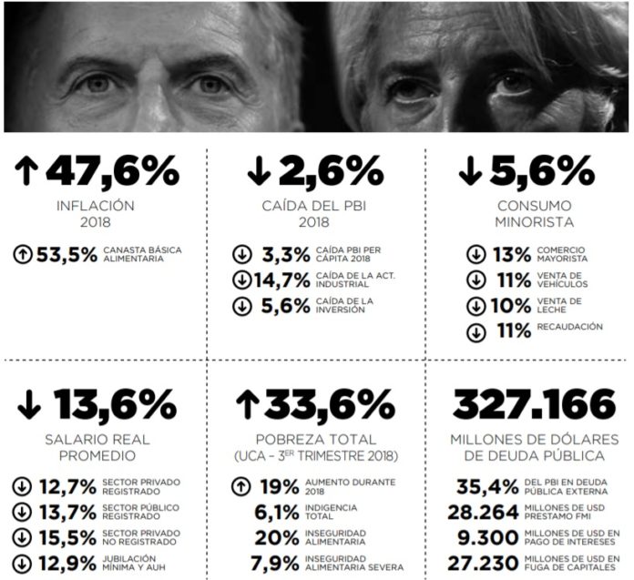 Como una burla macabra, el FMI felicitó al gobierno porque logró cierta estabilidad en el tipo de cambio, a fuerza de recesión, mayor endeudamiento y altas tasas de interés para alimentar especulación financiera. Y para este año, se espera una nueva contracción de la economía –de un 1,7% según el propio FMI– y una inflación superior al 30%. El gobierno garantiza jugosas ganancias a terratenientes, monopolios y bancos. Pero el pueblo seguirá sufriendo las consecuencias… mientras siga este gobierno.
