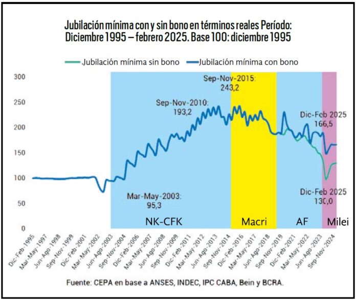 Milei había modificado la fórmula previsional por DNU 274/24 –derogando la Ley 27.609 vigente desde 2021– y ató así los haberes a la inflación. Esto garantiza que los y las jubiladas no sigan perdiendo frente a la inflación, pero “implica dejar congeladas las jubilaciones en el piso histórico en el que hoy se encuentran, sin posibilidades de mejorar”, según afirma CEPA. La infografía evidencia la caída que vienen sufriendo las jubilaciones desde 2015, el pozo ocasionado por la megadevaluación al inicio del gobierno de Milei y el piso en que pretende dejarlas.