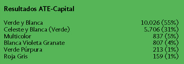 Desde esta unidad participamos llamando a votar en Capital a la Lista Verde y Blanca, donde particularmente se jugaba la reafirmación de esta línea política de unidad en la Seccional. En organismos nacionales como el Ministerio de Salud y la CNEA, donde formamos parte de las juntas internas y cuerpos de delegados, la Lista Verde y Blanca obtuvo 82% en Salud frente a 12% de la Lista Celeste y Blanca (Verde); y 42% en CNEA frente a 40% de la Lista Celeste y Blanca (Verde), que incluyó también a trabajadores de Dioxitek, Conicet y la Autoridad Regulatoria Nuclear.