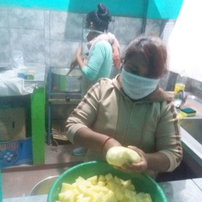 Alina: –Por ahora estamos tres compañeros, más que todo para cocinar, y dos se encargan de llevar la mercadería. Hasta que pase la epidemia estamos tratando de hacerlo así. Después integraremos más compañeros. Entran a las dos de la tarde y después a las 6:30hs es cuando se da ya la comida [para la cena].