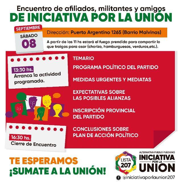 En un clima de mucha unidad y ganas de largar una nueva etapa en la vida de INICIATIVA POR LA UNIÓN, el pasado 8 de septiembre se dieron cita más de treinta dirigentes, afiliados y simpatizantes que debatieron la situación del país y de la provincia. Se relataron las luchas y la situación de cada sector expresado centralmente en la ola de despidos que padece la industria electrónica y el castigo de la política de Bertone vuelca sobre las trabajadoras/res estatales donde los docentes aún no tuvieron paritarias. Fue muy importante la presencia de dirigentes sindicales judiciales, docentes, estatales, municipales, de barrios y trabajadoras/res de la Cooperativa Renacer y jóvenes estudiantes.